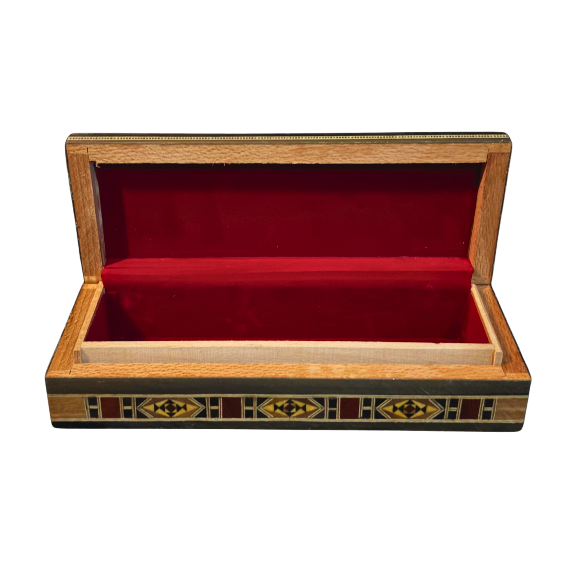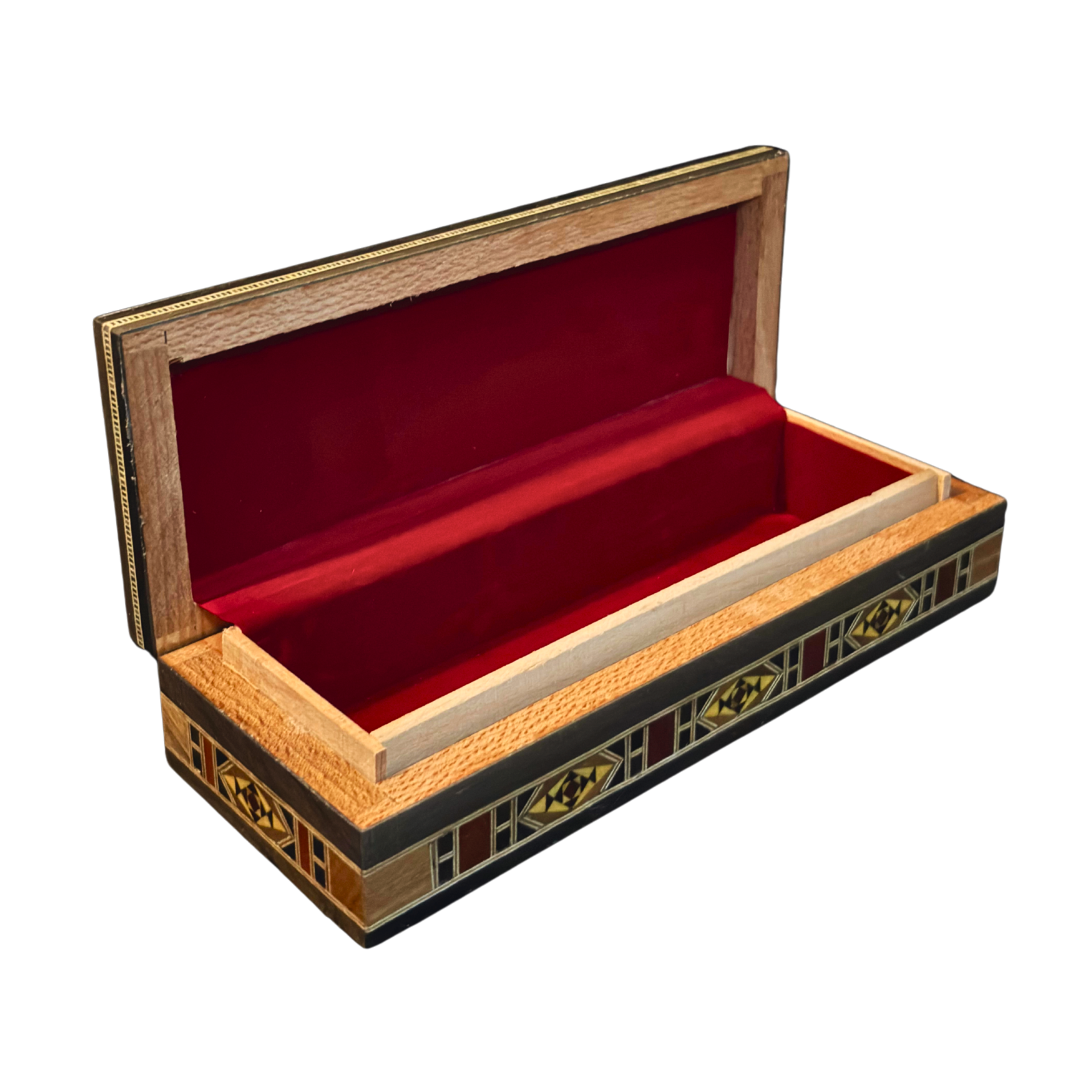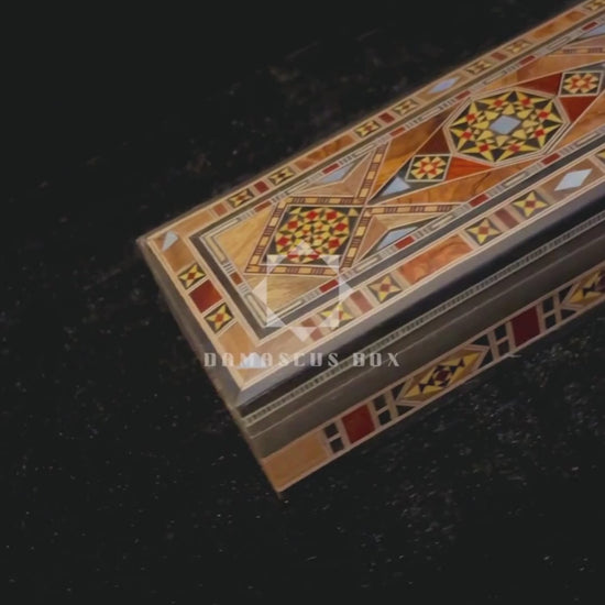 handgefertigte Mosaik-Holzbox, lange rechteckige Einlegebox, Perlmutt-Stiftebox, syrische Mosaik-Schmuckbox, hölzerne Andenkenkiste, elegantes handgefertigtes Geschenk, arabische geometrische Dekoration, orientalische Kunstbox, kunsthandwerkliche Aufbewahrungsbox, Damascus Box, syrische Schatulle, Geschenk für Sie, Geschenk für Ihn