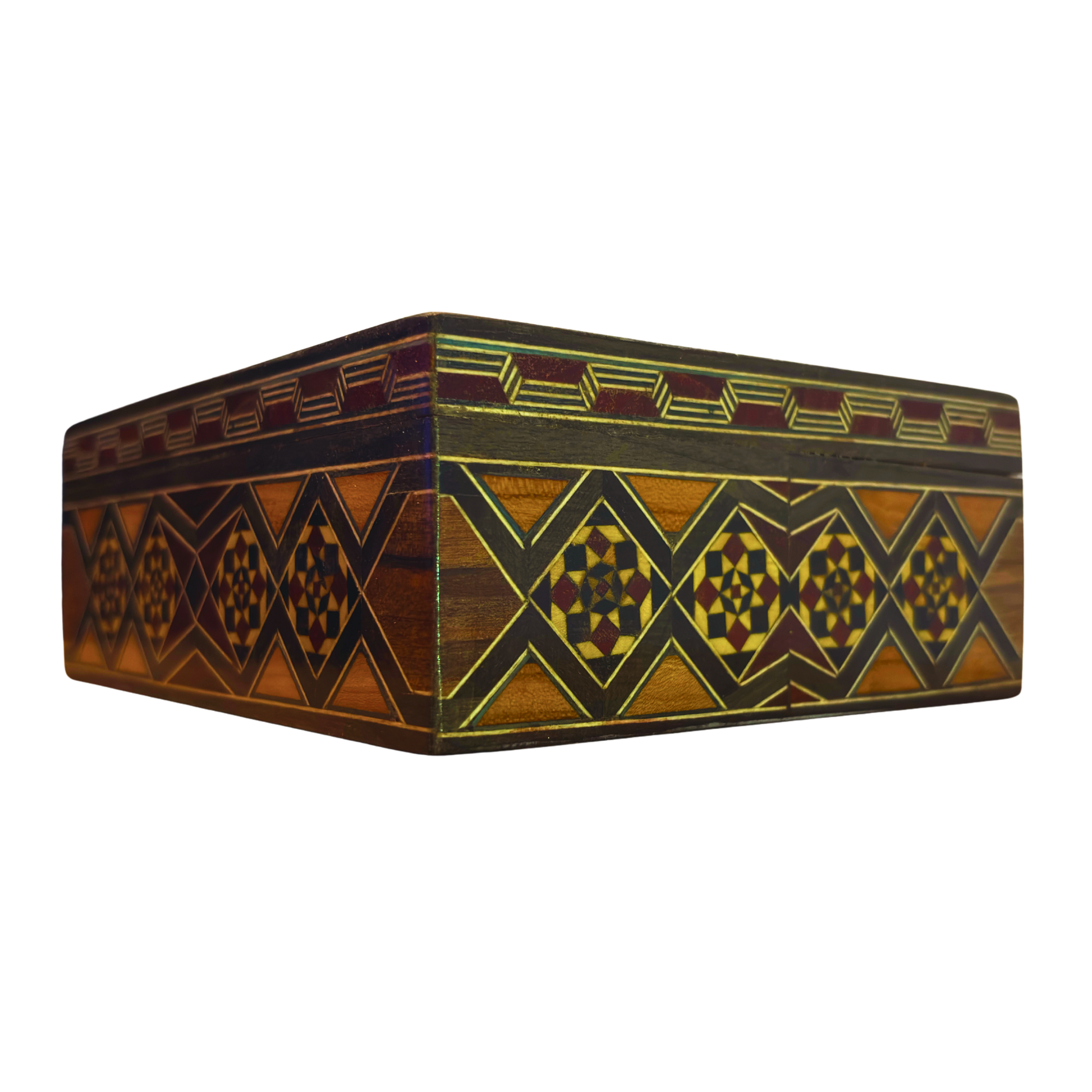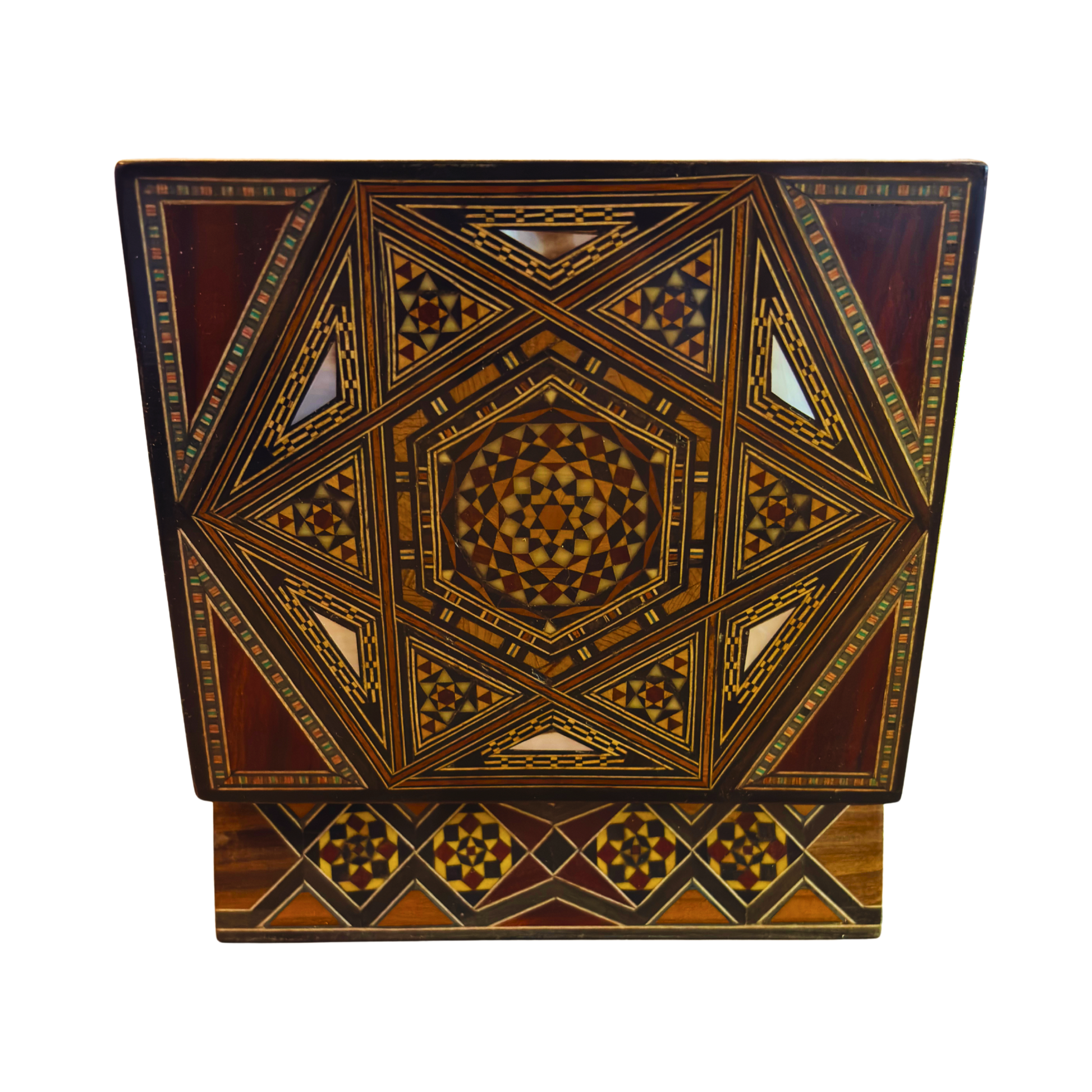 Questa scatola damaschina a mosaico è un’opera del celebre Gaby Al Dayeh, maestro artigiano di 90 anni considerato un simbolo vivente dell’arte del mosaico siriano.