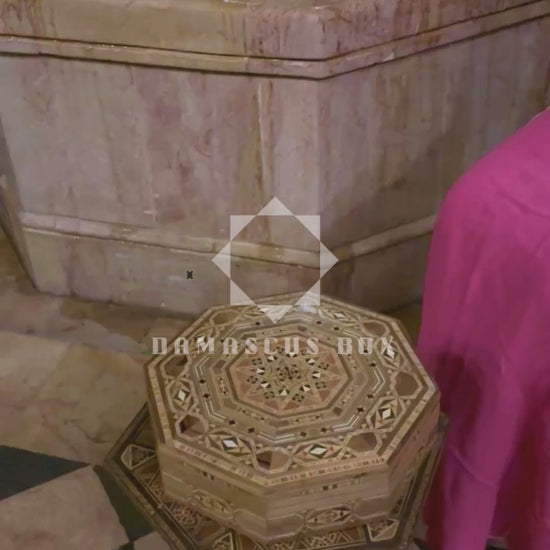 Met de hand gemaakt van geel dennenhout, rozenhout, citroenhout en beukenhout, weerspiegelt ze de warme natuurlijke tinten van Syrische mozaïekkunst.